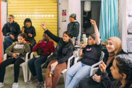 Mit Kindern und Jugendlichen zu arbeiten, entstand aus den Ergebnissen der Testspiele #1. Während der Woche im Herbst 2022 fiel zum einen auf, dass Kinder und Jugendliche kaum oder nur im Vorrübergehen in der Gegend des Billhorner Platzes sind. Ihre Flächen sind im Stadtteil anderswo – entsprechend der Stadtstruktur eher im Inneren der Stresowsiedlung, im Haus der Jugend, am Bolzplatz, im Entenwerder Park, an der neuen S-Bahn-Station Rothenburgsort, abgewandt von der kritischen Straßenverbindung Billhorner Röhrendamm und damit dem Ort, an dem in Zukunft der „Stadtplatz“, so die Bezeichnung im Rahmenplan Stadteingang Elbbrücken, entstehen soll. Zum anderen wurde bereits während der Recherchen im Vorfeld des Projektes deutlich, dass die Situation von Kindern und Jugendlichen im Rahmen der Coronapandemie nur wenig Repräsentation und Einfluss in die Politikgestaltung fand. Der Subtext des Entwurfes für das Wandbild war für die jugendlichen Künstler:innen schon an Tag eins des Workshops klar: Mehr Platz für Jugendliche in Rothenburgsort.