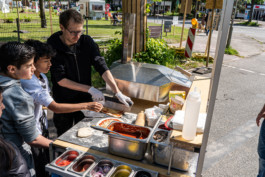 Für den Donnerstag, ein Feiertag, konnte eine Fahrbahn des Billhorner Mühlenwegs vom Billhorner Röhrendamm bis zur Marckmannstraße für Autos gesperrt werden. Flux schob Marius Mandery das von XYZ-Cargo gemietete Pizza Cargo Fahrrad auf die Straße und nahm den Ofen in Betrieb. Die Kinder und Jugendlichen übernahmen die Situation und bereiteten für sich und einige Passant:innen Pizza zu. Nur ein paar Meter weiter rappten und sangen andere Jugendliche des Ferienprogramms einigen ihrer liebsten Songs über einen tragbaren Lautsprecher, den sie mit Mikrofonen ausgestattet nach draußen gestellt hatten. Das Publikum nahm auf der langen Bank vor dem Mikropol und einem Podest an der Straßenkante Platz, oder stand entspannt auf der abgesperrten Straße. Auch hier zeigte sich, dass mit dem, was da ist, schon eine Menge Spaß und zu haben ist.