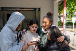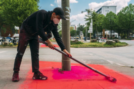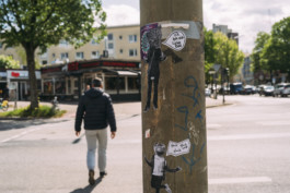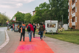 Im Verlauf der Woche entdeckten Besucher:innen der Testspiele immer mehr Spuren der Arbeit im Ferienprogramm. Die Kinder und Jugendlichen gingen Stück für Stück aus dem geschützten Raum des Mikropols heraus und klebten erste Zuschnitte auf Ampeln, Stromkästen, Schilder, die Anlaufstelle und weitere Gegenstände im öffentlichen Raum. Auch zum Pause machen, gingen die Teilnehmer:innen des Ferienprogramms auf die Straße.