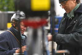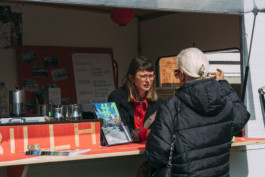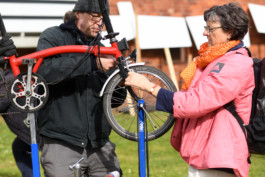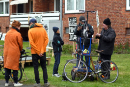 An vier der fünf Tagen lud Abendprogramm weitere Gäste auf die Fläche ein. Ingo Böttcher veranstaltete eine immer wieder im Stadtteil stattfindende Fahrradselbsthilfewerkstatt gleich neben der Anlaufstelle. Schon bevor der fahrbare Montageständer in Position und Ingo seinen ersten Cappuccino getrunken hatte, standen die Kund:innen Schlange. Fahrrad für Fahrrad leitete Böttcher die Reparaturarbeiten bis in die Abendstunden an.