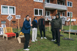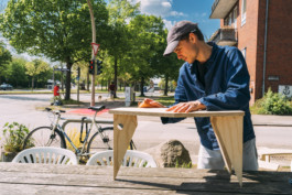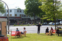 Möbel aus Bäckerkisten und Sperrholzplatten stehen verteilt auf der Wiese, die zuvor sogut wie nie zum Verweilen genutzt wurde. Dabei ist die Wiese im Nordosten der Kreuzung von morgens bis zur Dämmerung in der Sonne. Ab dem frühen Nachmittag dreht sich die Sonne immer mehr in die Fläche vor den Wohnbauten. An der Ecke der Kreuzung braucht es nicht viel, um einen Platz anzubieten. Die Möbel konnten in Absprache mit der Eigentümerin der Wohnbauten auch in den Tagen und Wochen nach den Testspielen #2 noch stehen bleiben.