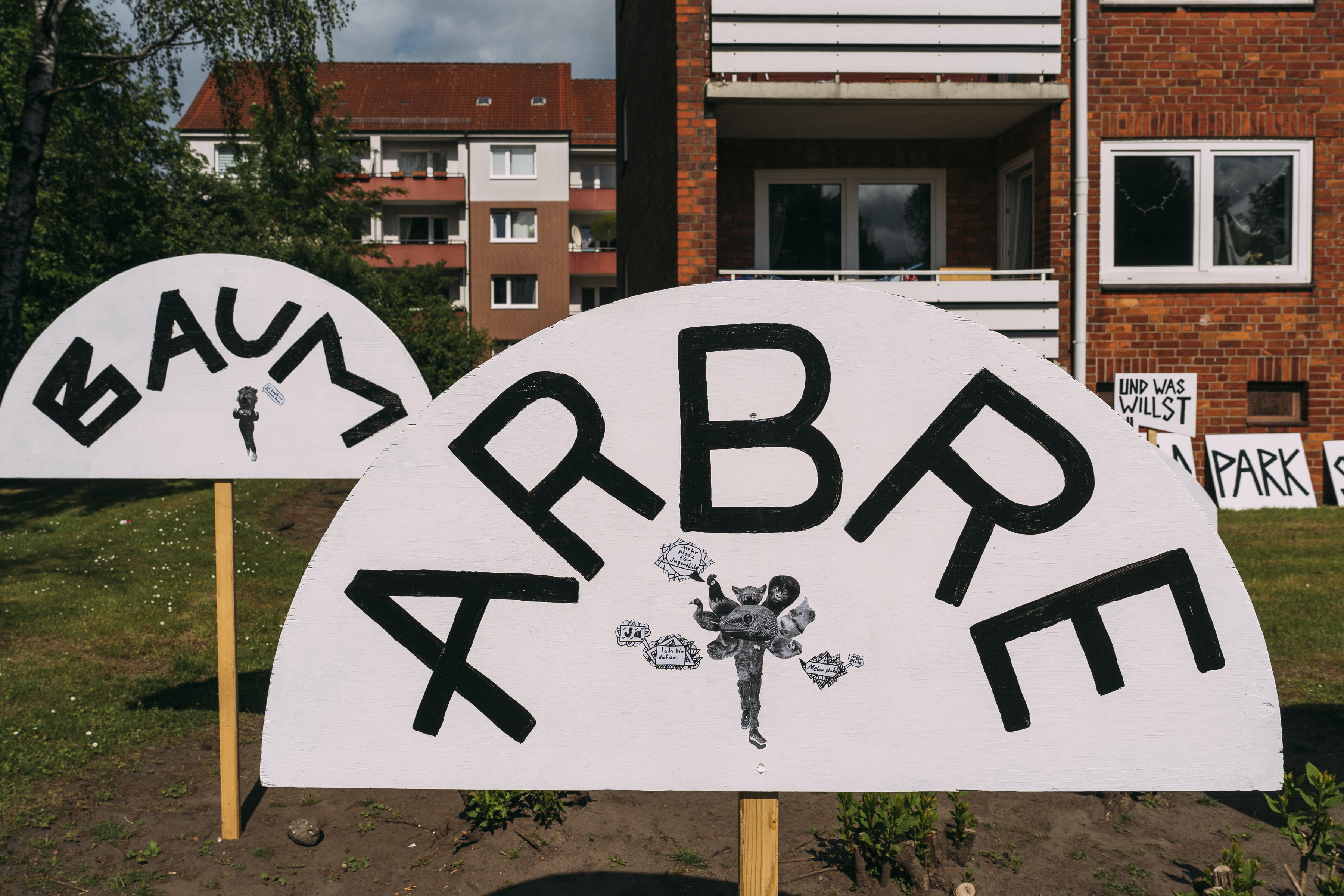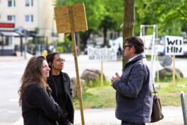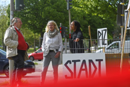 Was hat es mit den Schildern auf sich? Immer wieder stoppten Passanten, Besucher:innen gleichermaßen wie Bewohner:innen des Stadtteils, Motorrad-, P- und LKW Fahrer:innen, vereinzelt auch der BünaBe (bürgernaher Beamter der Polizei), Mitarbeiter:innen des Fachamts Management des öffentlichen Raums, Polizeistreifen, die Gewerbetreibenden der anliegenden Kioske und Restaurants um zu fragen, ob das hier eine Demonstration, ein Fest, eine Baustelle oder ähnliches sei. Die Schilder sind der Situation der Verkehrskreuzung entnommen. und wurden in den vor den Testspielen mit Plänen und isometrischen Zeichnungen der Kreuzung plakatiert und mit Themen und O-Tönen aus dem bisherigen Prozess und den Themenfeldern des Bundesförderprogramms Post-Corona-Stadt beschriftet. Die Schilder stecken angespitzt in der Erde, oder in Bakenfüßen auf versiegelten Flächen.