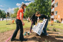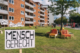 Im Mikropol leiteten die Künstler:innen Sandy Kaltenborn und Stefan Endewardt (image-shift) zusammen mit Suna J. Voß und Nebou N’Diaye (dock europe) ein Ferienworkshop. Kinder und Jugendliche aus dem Stadtteil erarbeiteten Motive für ein riesiges Wandbild, das ab Ende Juni den Billhorner Platz zieren wird. Am Rothenburgsorter Marktplatz „hängt“ seit vielen Jahren ein Wandbild, das damals Künstler:innen aus dem „Mercedes-Haus“ realisiert hatten. Für die Testspiele #2 nutzten projektbüro und raumlabor dieses im Stadtteil bekannte Medium und übersetzten es in die Fragestellung des Projektes Post-Corona-Stadt.
