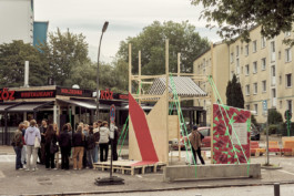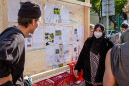 Für alle Spaziergänge standen Dolmetscher:innen in English, Französisch und Türkisch bereit. Als Treffpunkt und gut sichtbare Landmarke entwarf raumlaborberlin die Anlaufstelle – eine Art Kiosk aus Holz, den projektbüro und raumlaborberlin mithilfe einiger Leute aus dem Umfeld des Mikropols, einem Projekt und Ort für stadtteilöffentliche Nutzungen direkt gegenüber der Anlaufstelle, in wenigen Tagen auf der eigens dafür gesperrten Parkplatzfläche zwischen den beiden Restaurants im Süden der Kreuzung errichteten. Abseits der Führungen lud die Anlaufstelle zu Tee, Essen und Austausch für Interessierte ein. So ergaben sich viele zufällige als auch geplante Begegnungen mit Bewohner:innen als auch Besucher:innen.