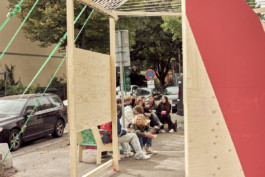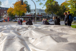 Bereits beim Aufbau machte die Stadtmatratze von raumlaborberlin deutlich, dass es kein einfaches Unterfangen sein wird die Straßenkreuzung zum Platz zu verändern. Die unzähligen und in langwieriger Arbeit aufgeblasenen Gymnastikbälle der Stadtmatratze mussten von der Verkehrsinsel beim Mikropol auf die Flächen vor die benachbarten Wohngebäude befördert werden, wie Schafe von dem Stall auf die Weide. Dabei büxten einige Bälle kurzfristig aus, konnten aber von den Mitarbeiter:innen von raumlaborberlin und projektbüro immer wieder eingefangen werden, bevor sie den Verkehr beeinträchtigten. Zusammen mit zwei Hochtreppen lud die Stadtmatratze zum Perspektivwechsel ein.