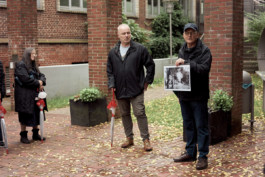 Ingo Böttcher von der Initiative Hamburgs Wilder Osten begab sich mit seinem Spaziergang auf historische Spurensuche. Er spazierte mit den Teilnehmer:innen an Orte an denen die Geschichte des Stadtteils nicht mehr oder nur noch für Kenner:innen greifbar ist, zeigte dort historische Aufnahmen und setzte sie in Beziehung zur heutigen Situation. Zu Beginn des Spaziergangs nutzte er die Holzverkleidung der Anlaufstelle als Tafel um sich und den Teilnehmer:innen als auch einigen Passant:innen und Besucher:innen der Testspiele ein Bild von der Entstehungsgeschichte Rothenburgsorts zu machen.