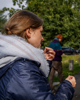 Den Abschluss am Sonntag machte die Künstlerin Julia Nordholz mit einem Spaziergang zum Thema Stadtkräuter. Zu Beginn wurde den Teilnehmer:innen heißes Wasser aus einem Samowar und frisch gepflückte Kräuter zu einem Tee angeboten, bevor sie selbst in der direkten Umgebung des Billhorner Platzes nach Kräutern suchten und diese identifizierten. Der Spaziergang machte viele große Welten im Kleinen auf und zeichnete das Bild eines Platzes voller besonderer Freiräume jenseits versiegelter Straßen.